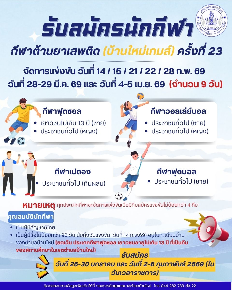 เปิดรับสมัครเข้าร่วมการแข่งขันกีฬาต้านยาเสพติด (บ้านใหม่เกมส์) ครั้งที่ 23 ประจำปีงบประมาณ พ.ศ. 2569