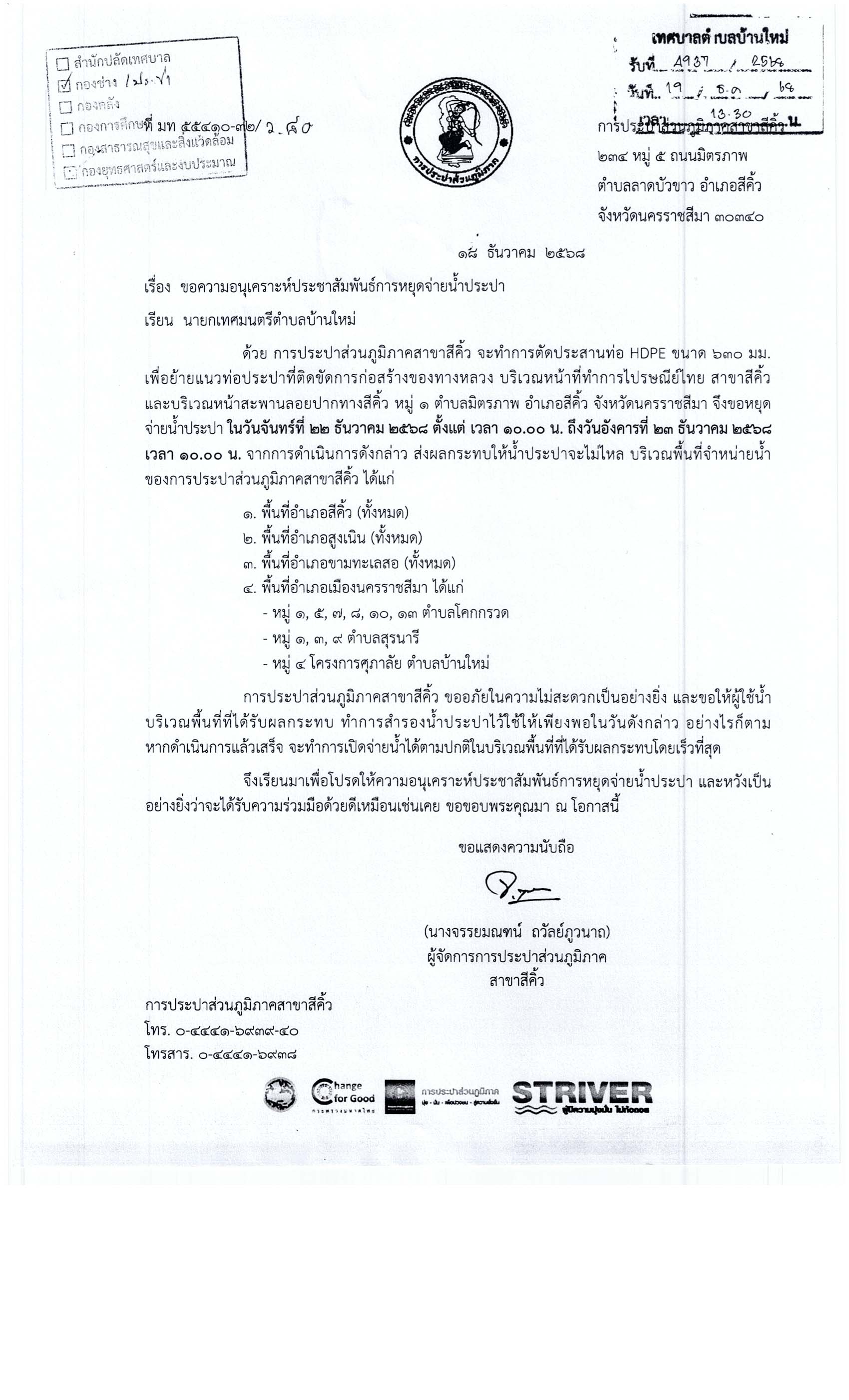 งดจ่ายน้ำประปาเป็นการชั่วคราว |